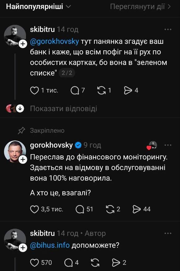 "Переслав до фінансового моніторингу. Здається, на відмову в обслуговуванні вона 100% наговорила. А хто це, взагалі?" - написав Гороховський.