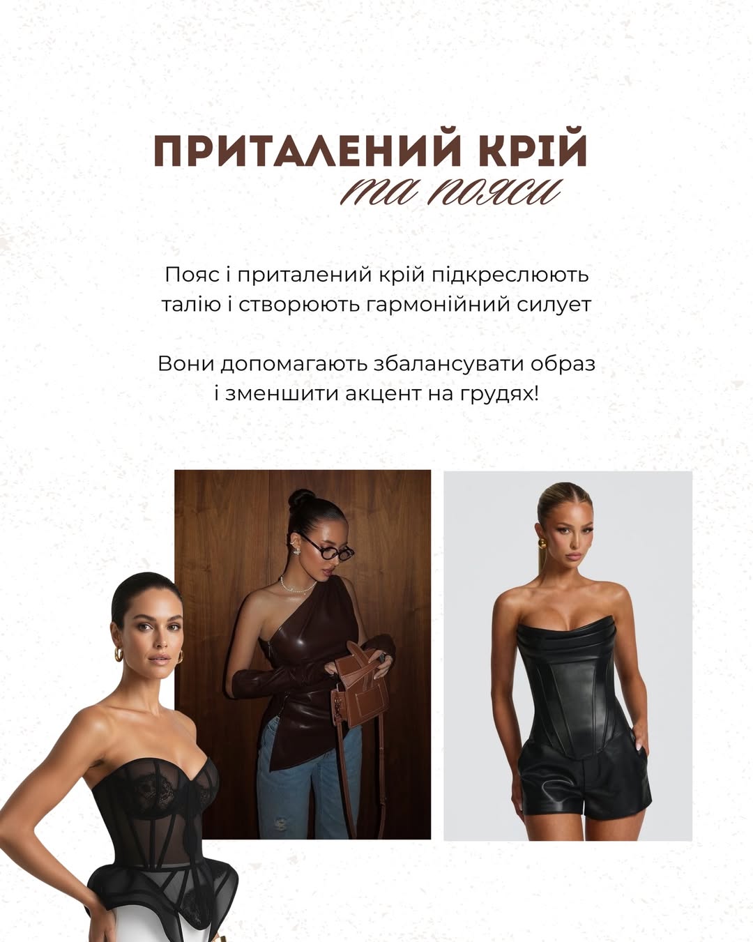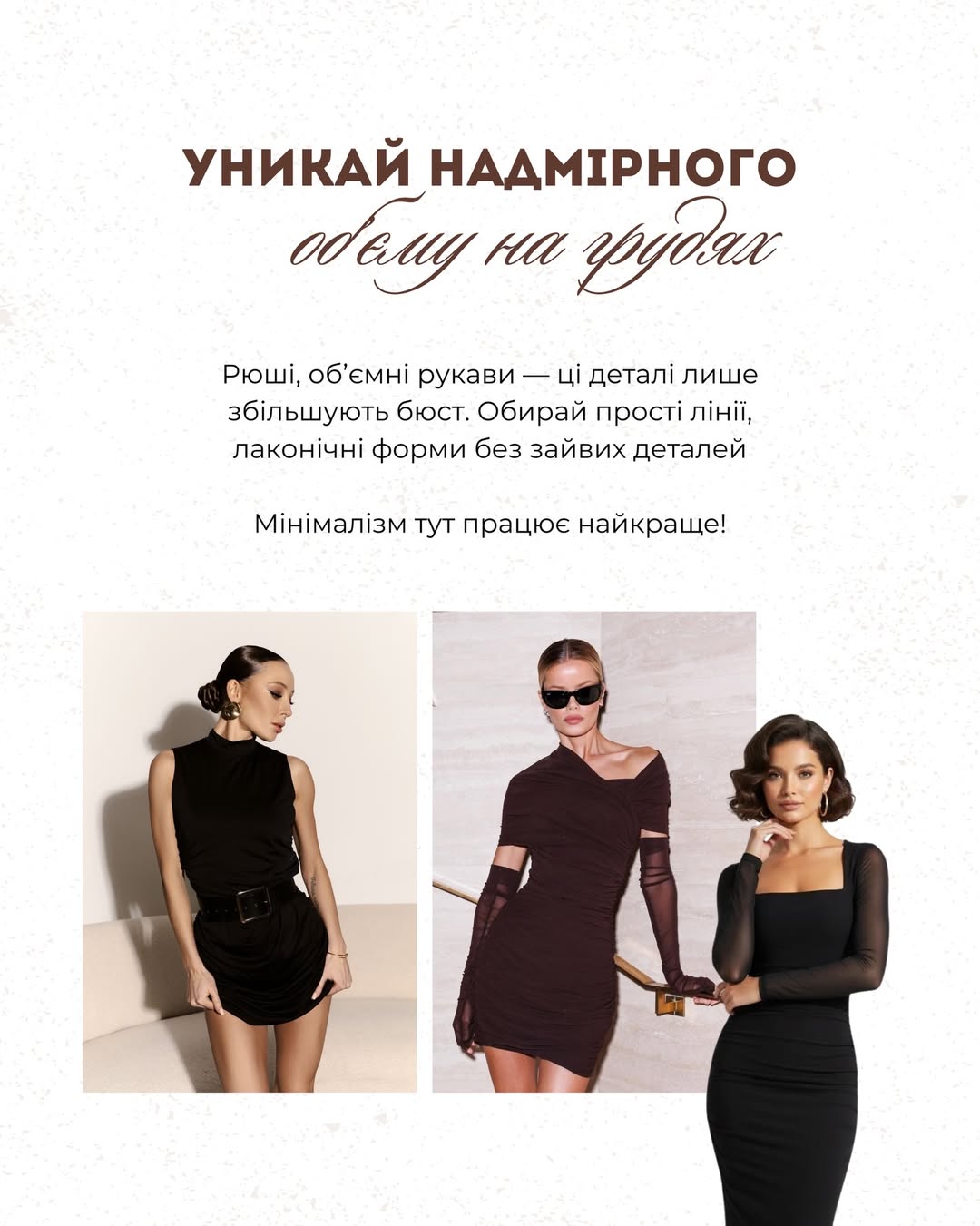 Такий прийом зменшує візуальний акцент на бюсті та робить образ більш пропорційним та жіночним.