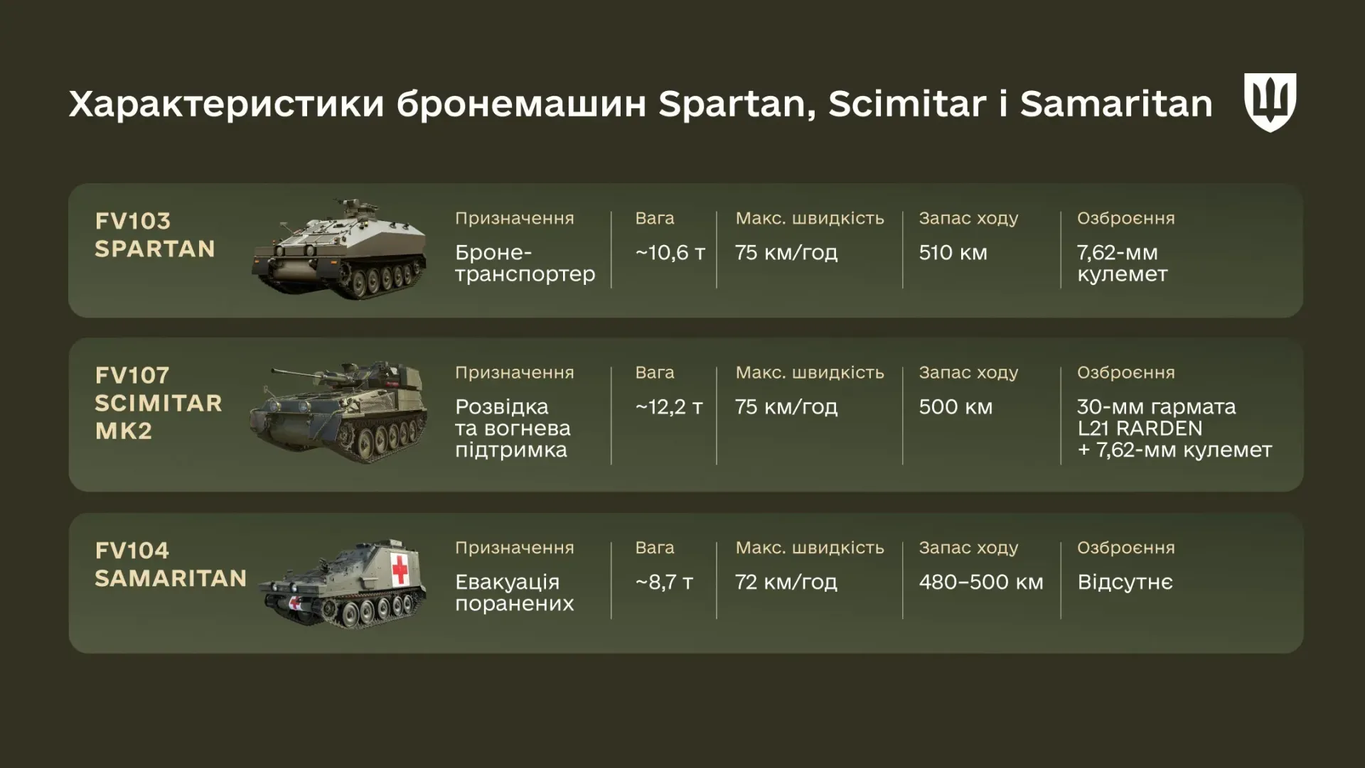 Характеристики бронемашин CVR(T)У Збройних Силах України застосовуються, зокрема, бронемашини FV103 Spartan, FV104 Samaritan та FV107 Scimitar Mk2.