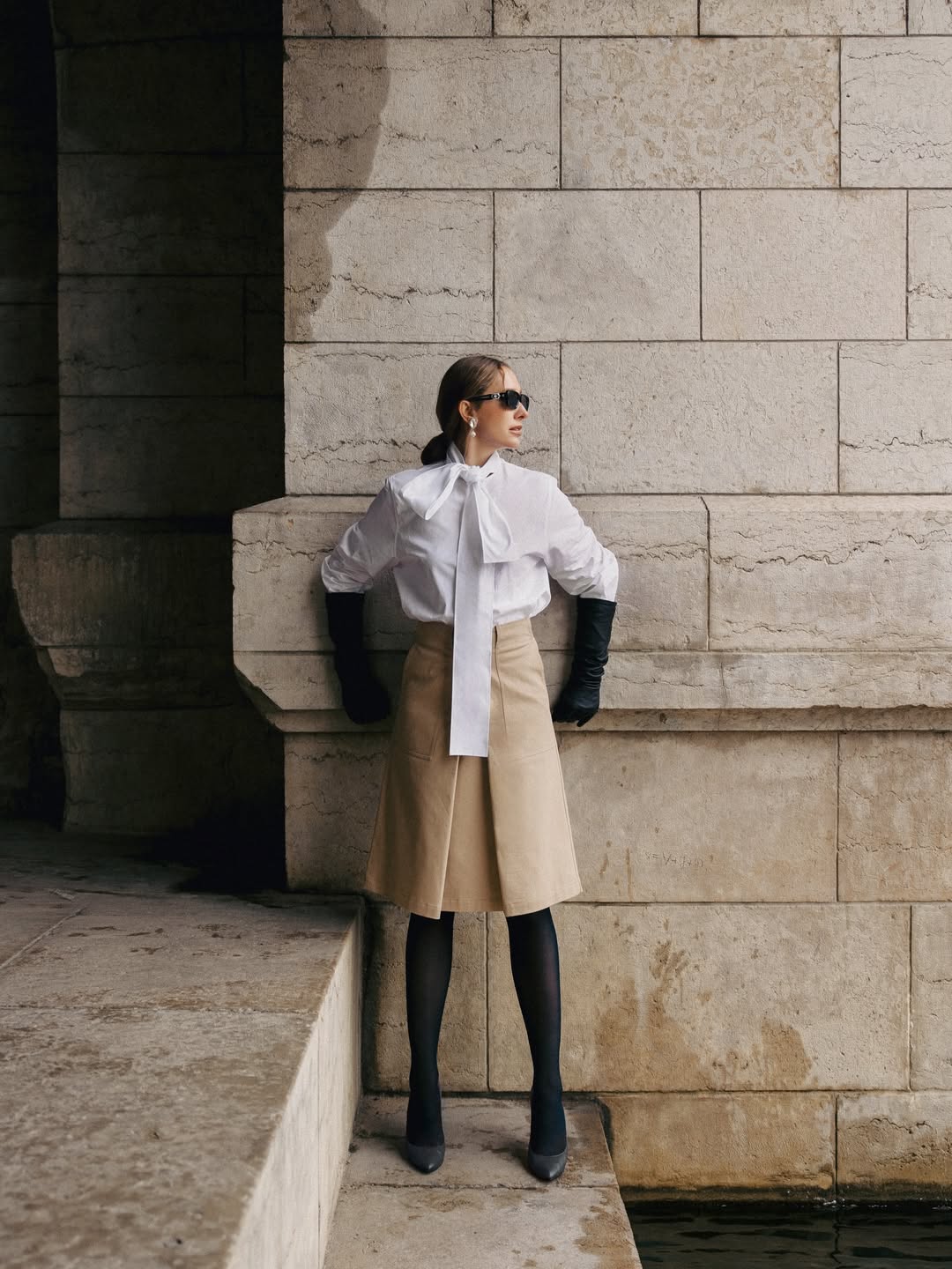 - біла блуза з масивним бантом, що додає образу романтичності;