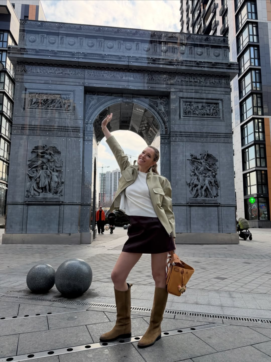 Головним акцентом стали високі замшеві чоботи без підборів у пісочному кольорі. Таке поєднання довжини міні та грубого взуття - ідеальне рішення для міських прогулянок, коли хочеться виглядати жіночно, але відчувати комфорт.