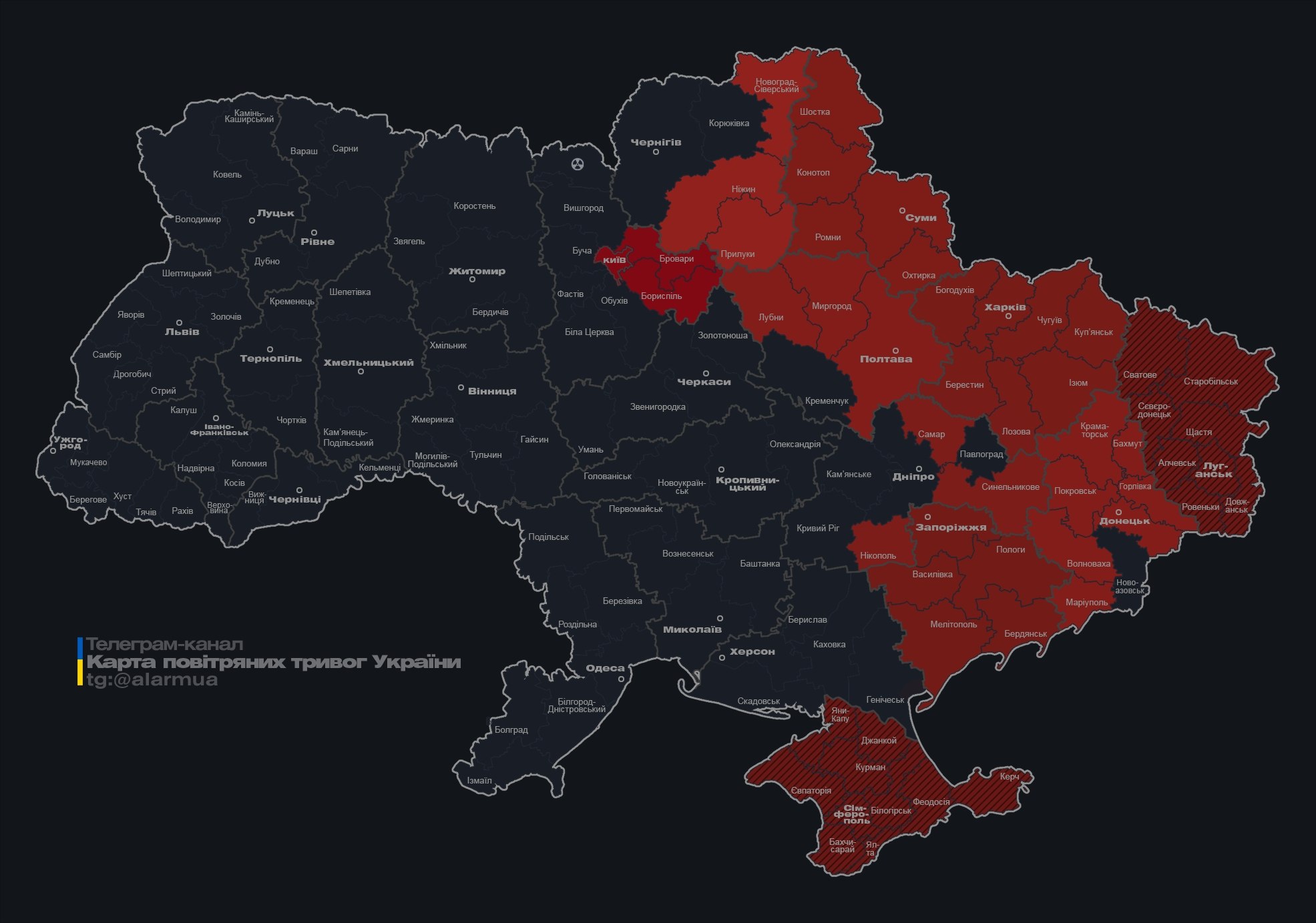 Де оголосили тривогуСтаном на 06:43 карта повітряних тривог має такий вигляд. Як можна побачити, сигнал продовжується у Київській, Чернігівській, Сумській, Полтавській, Харківській, Дніпропетровській, Запорізькій та Донецькій областях.