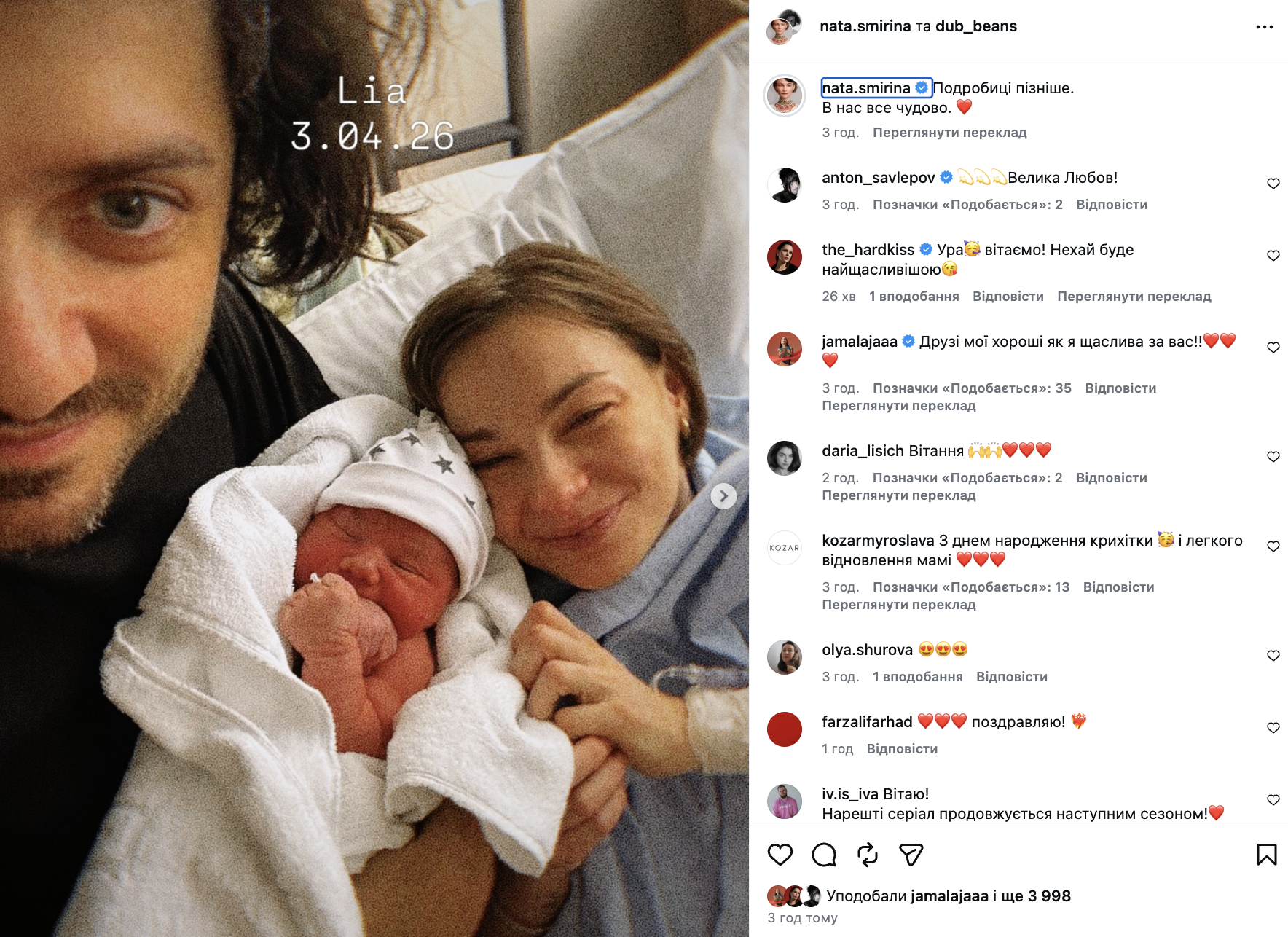 Під дописом артистки одразу з’явилися десятки теплих слів від шанувальників і колег. Її вітали з народженням доньки, бажали легкого відновлення та щасливої долі для маленької Лії.