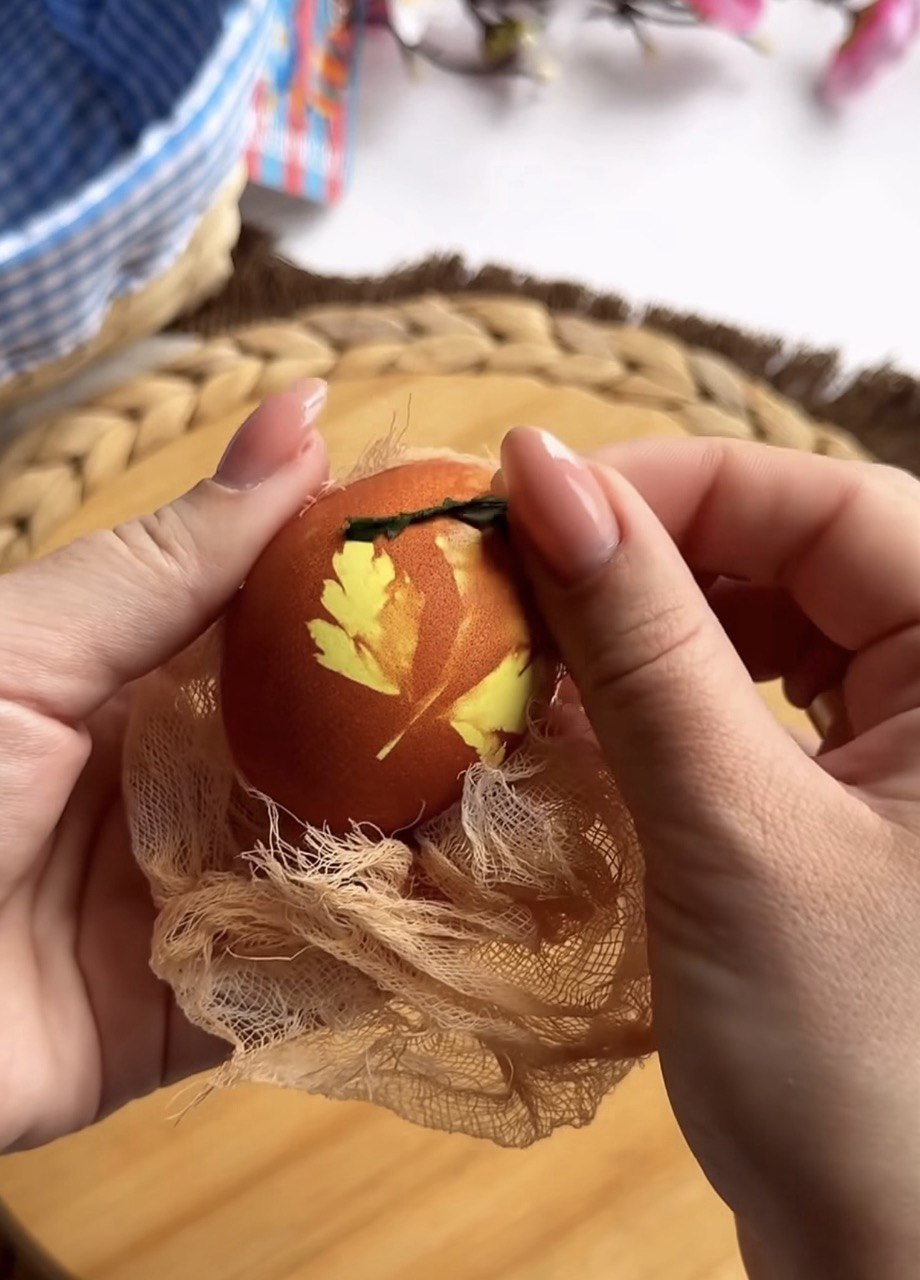 Для перших крашанок візьміть цибулеве лушпиння, покладіть у каструлю та залийте водою. Прикладіть до яєць мокре листя та туго обмотайте марлею та зав'яжіть ниткою. Покладіть у каструлю та варіть 10 хв після закипання.